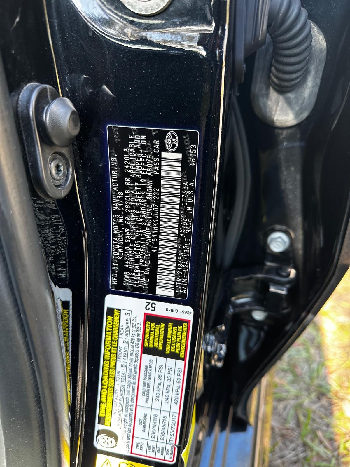 VIN: 4T1B11HK1JU071232